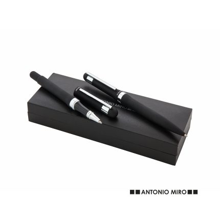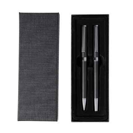 Ξεχωριστό σετ στυλό και roller στυλό, σχεδιασμένα και τα δύο με κομψά μαύρα σώματα αλουμινίου και ροζ χρυσά διακοσμητικά στοιχεία.