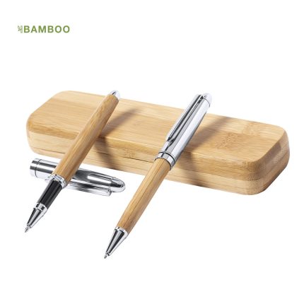 Σετ στυλό με μηχανισμό push-up και μηχανικό μολύβι σε πρωτότυπο συνδυασμό από φυσικό ξύλο μπαμπού και αξεσουάρ μεταλλικού φινιρίσματος σε γυαλιστερό ασημί χρώμα.