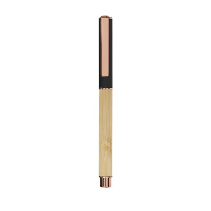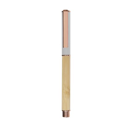 Με μεταλλικό κλιπ, λαβή και επιχρωμίωση, λεπτομέρειες από ροζ χρυσό, σώμα από μπαμπού και έγχρωμο καπάκι αλουμινίου.