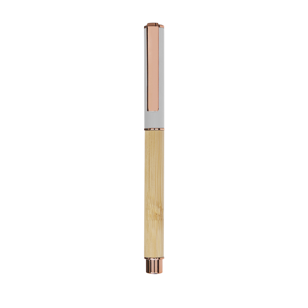 Με μεταλλικό κλιπ, λαβή και επιχρωμίωση, λεπτομέρειες από ροζ χρυσό, σώμα από μπαμπού και έγχρωμο καπάκι αλουμινίου.