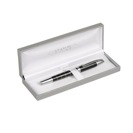 Ρόλερ και στυλό ball pen Zeus πολυτελείας μάρκας STATUS μαύρο με ασημί λεπτομέρειες σε γκρι κουτί με λευκό σατέν εσωτερικά